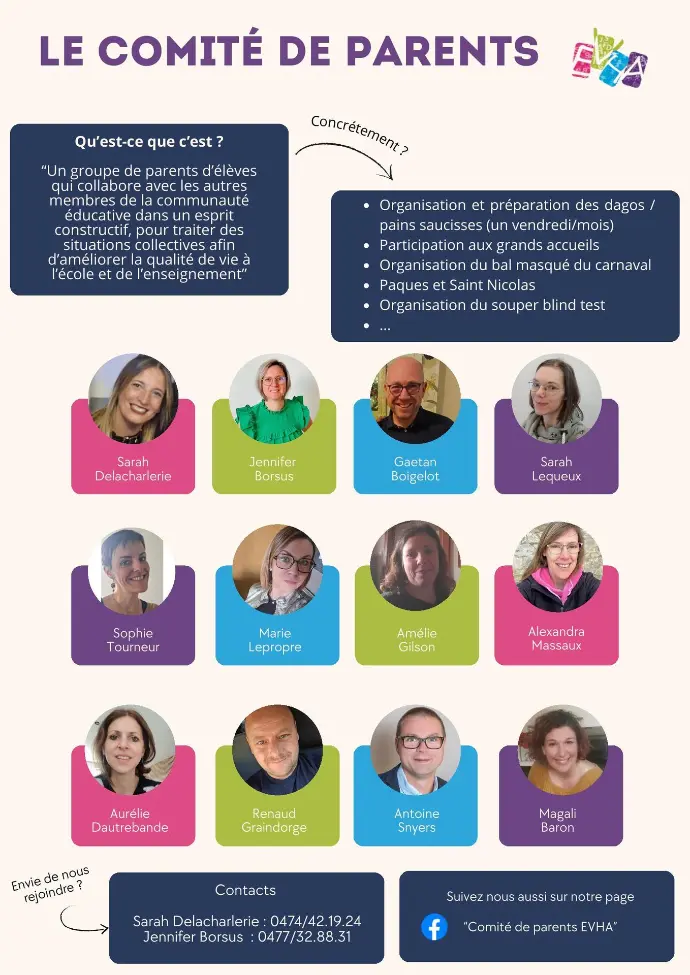 Le comité de parents est un véritable moteur au cœur de la vie de l’école. Dynamique, engagé et à l’écoute, il rassemble des parents motivés qui souhaitent s’impliquer activement dans le quotidien scolaire de leurs enfants. Par son énergie et ses initiatives, il joue un rôle essentiel dans l’organisation d’événements, le soutien aux projets pédagogiques et la création de moments de rencontre conviviaux.